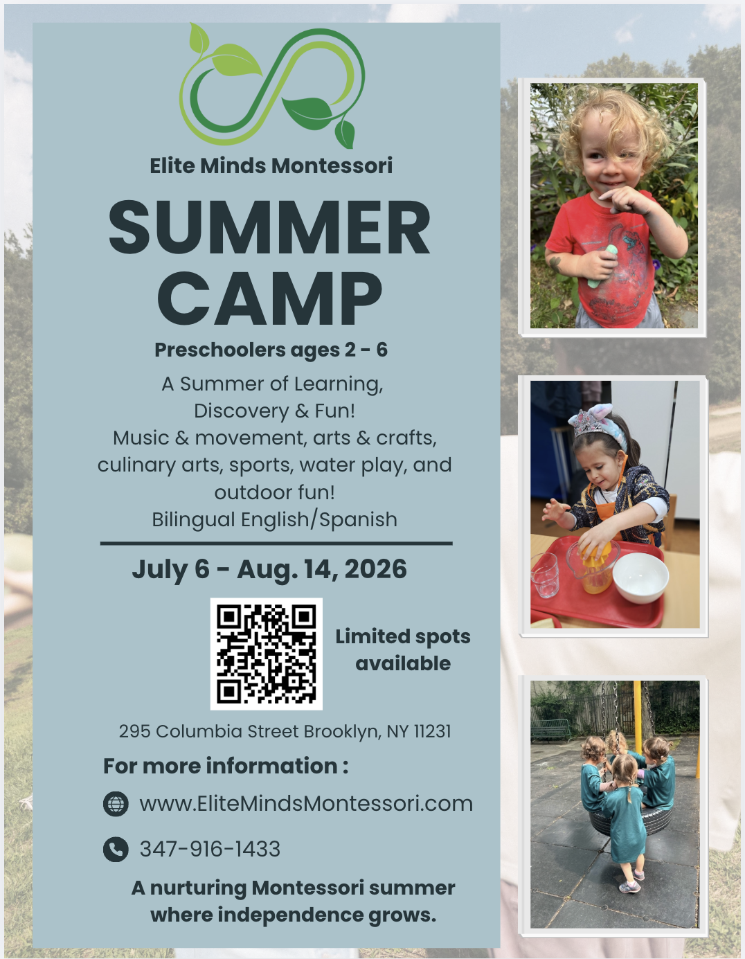 Our days are mostly spent outdoors, learning and playing. We visit Mother Cabrini and other outdoor areas daily, with Brooklyn Bridge Park outings on Fridays. Water play, Yoga, Art, Music, and daily mindfulness are important parts of our camp days. Starting in 2026, we will also incorporate food prep and sports clinics.